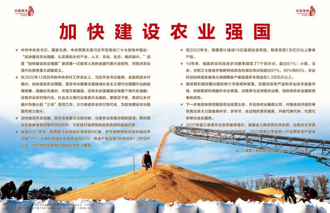 ◆ 在2022年12月召開的中央農(nóng)村工作會(huì)議上,習(xí)近平總書記強(qiáng)調(diào),全面推進(jìn)鄉(xiāng)村振興、加快建設(shè)農(nóng)業(yè)強(qiáng)國(guó),是黨中央著眼全面建成社會(huì)主義現(xiàn)代化強(qiáng)國(guó)作出的戰(zhàn)略部署。強(qiáng)國(guó)必先強(qiáng)農(nóng),農(nóng)強(qiáng)方能國(guó)強(qiáng)。沒有農(nóng)業(yè)強(qiáng)國(guó)就沒有整個(gè)現(xiàn)代化強(qiáng)國(guó);沒有農(nóng)業(yè)農(nóng)村現(xiàn)代化,社會(huì)主義現(xiàn)代化就是不全面的。要鉚足干勁,抓好以鄉(xiāng)村振興為重心的“三農(nóng)”各項(xiàng)工作,大力推進(jìn)農(nóng)業(yè)農(nóng)村現(xiàn)代化,為加快建設(shè)農(nóng)業(yè)強(qiáng)國(guó)而努力奮斗。