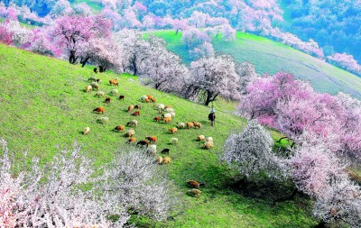 你且看伊犁河谷——蜿蜒的山坡披覆錦繡,層層疊疊的粉白自谷底漫卷山腰。風(fēng)起時,花瓣簌簌飄落,遠(yuǎn)處的牧人勒馬駐足。恍惚間,難辨是大地托起了云霞,還是云霞墜入了人間。
