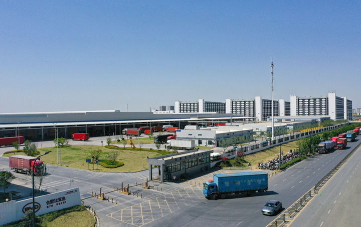 春風和煦,楊柳輕舞,從合肥市區(qū)驅車向北約35公里,行至長豐縣中南部的下塘鎮(zhèn),以比亞迪命名的主干道上,運送汽車零部件的貨車排成長長一列,魚貫而入比亞迪合肥基地園區(qū)。