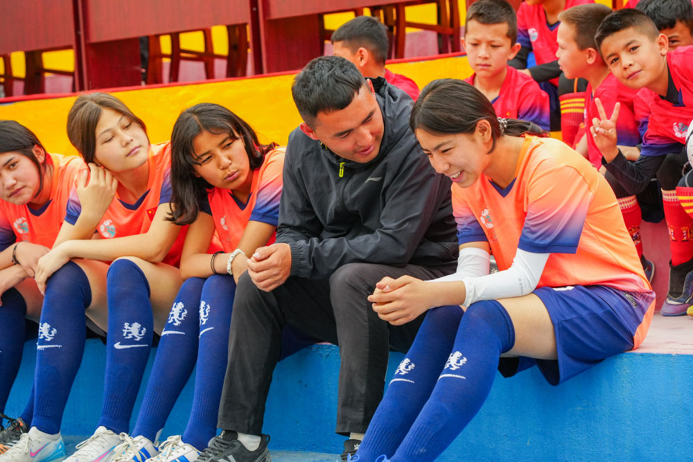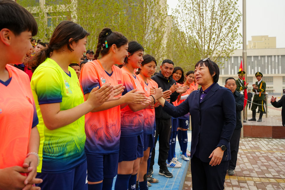 ↑4月12日,2025新疆克孜勒蘇柯爾克孜自治州足球聯(lián)賽開幕式后,中國足協(xié)副主席、前中國國家女子足球隊球員孫雯(前右一)與阿圖什市U13女子足球隊隊員阿依謝·托乎達(dá)洪(左三)交流。新華社記者 徐宏巖 攝