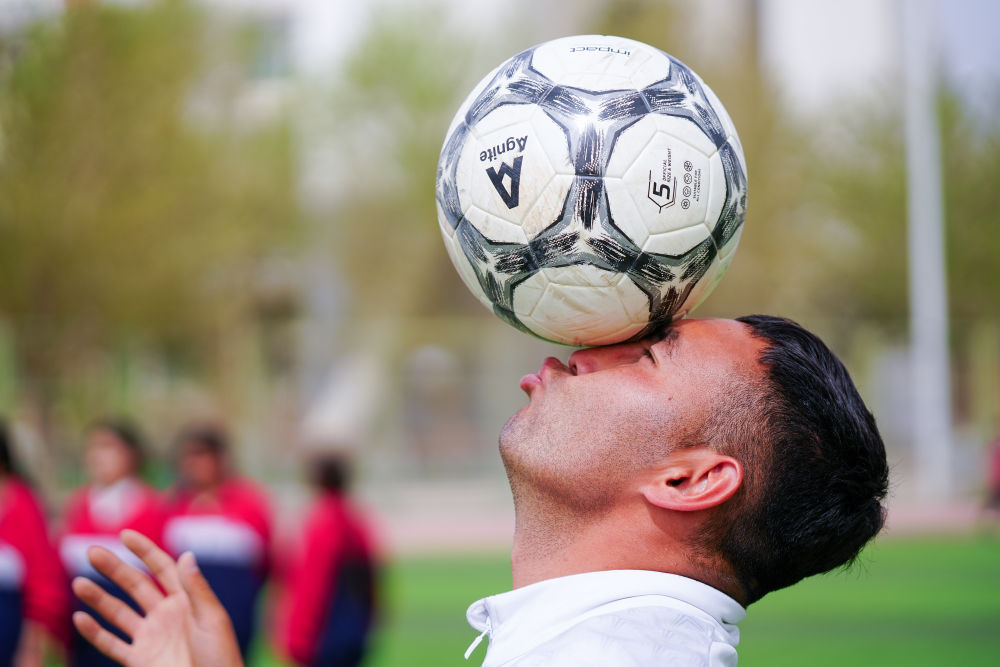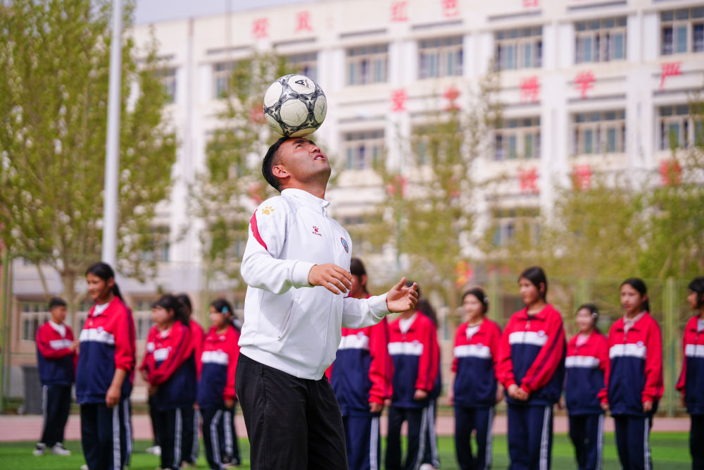 ↑4月14日,在阿圖什市硝魯克中學(xué),教練如扎吉為隊員演示頭部停球。新華社記者 徐宏巖 攝