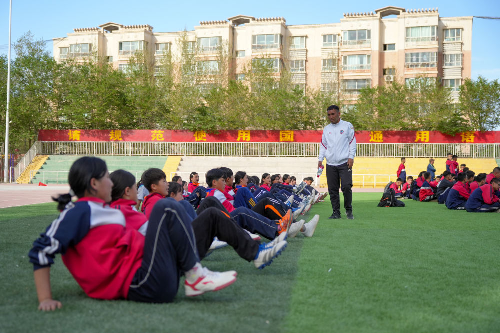 ↑4月10日,在阿圖什市硝魯克中學(xué),隊員們在教練如扎吉的指導(dǎo)下進(jìn)行訓(xùn)練。新華社記者 徐宏巖 攝