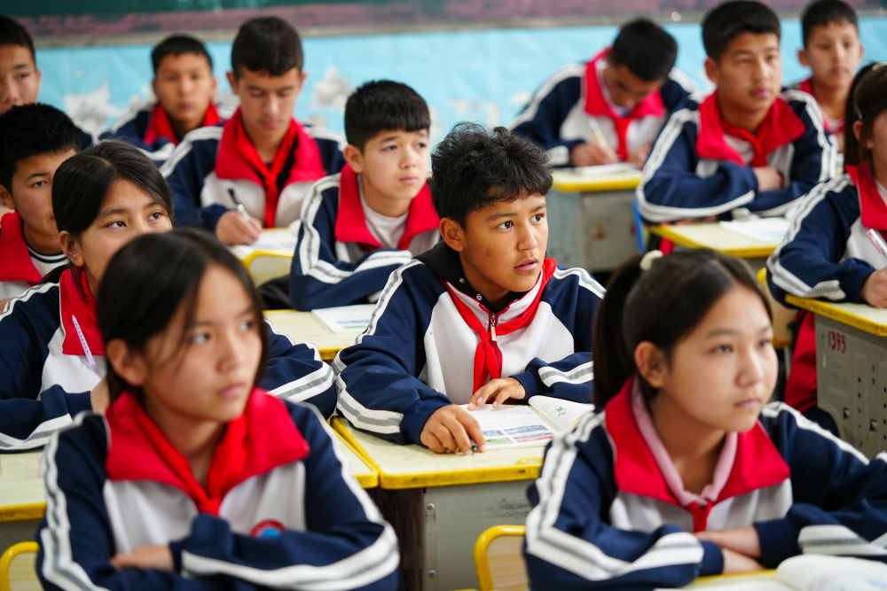↑4月14日,在阿圖什市硝魯克中學(xué),球隊前鋒謝爾克努爾·亞力坤(二排左二)在教室里上課。新華社記者 徐宏巖 攝