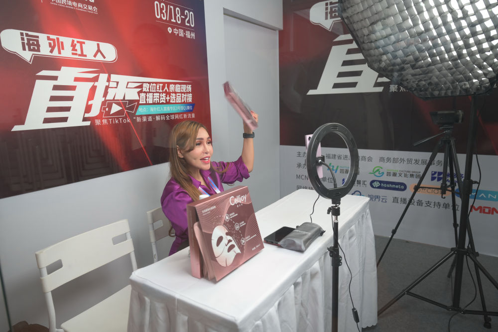 2024年3月18日,一名馬來(lái)西亞主播在福建福州舉行的第四屆中國(guó)跨境電商交易會(huì)展會(huì)現(xiàn)場(chǎng)直播帶貨。