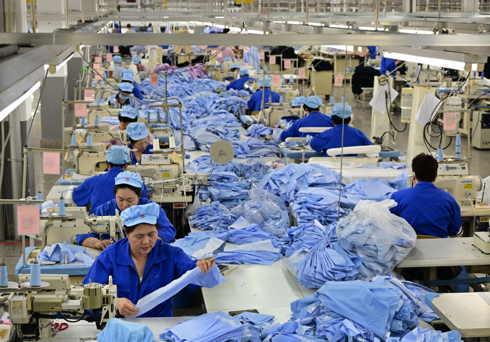 3月25日,山東青島即墨區(qū)即發(fā)工業(yè)園內(nèi)一家服裝企業(yè)的職工在使用智能縫紉機(jī)進(jìn)行生產(chǎn)。新華社記者 李紫恒 攝