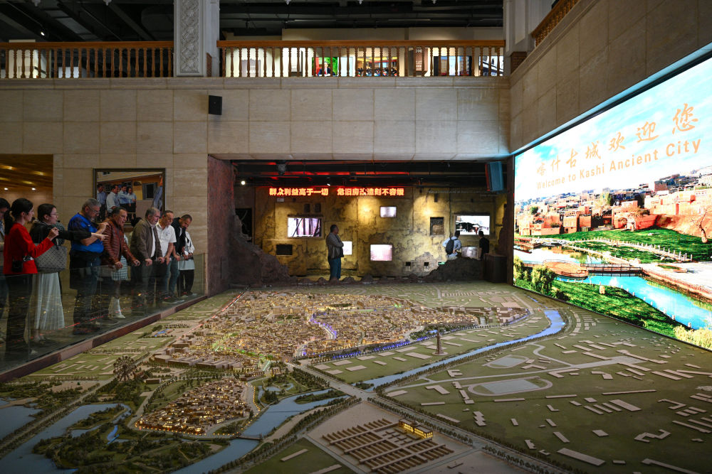 4月25日,來自埃及、伊朗、土耳其等國的外賓在喀什市老城區(qū)保護(hù)綜合治理紀(jì)念館參觀。新華社記者 辛悅衛(wèi) 攝