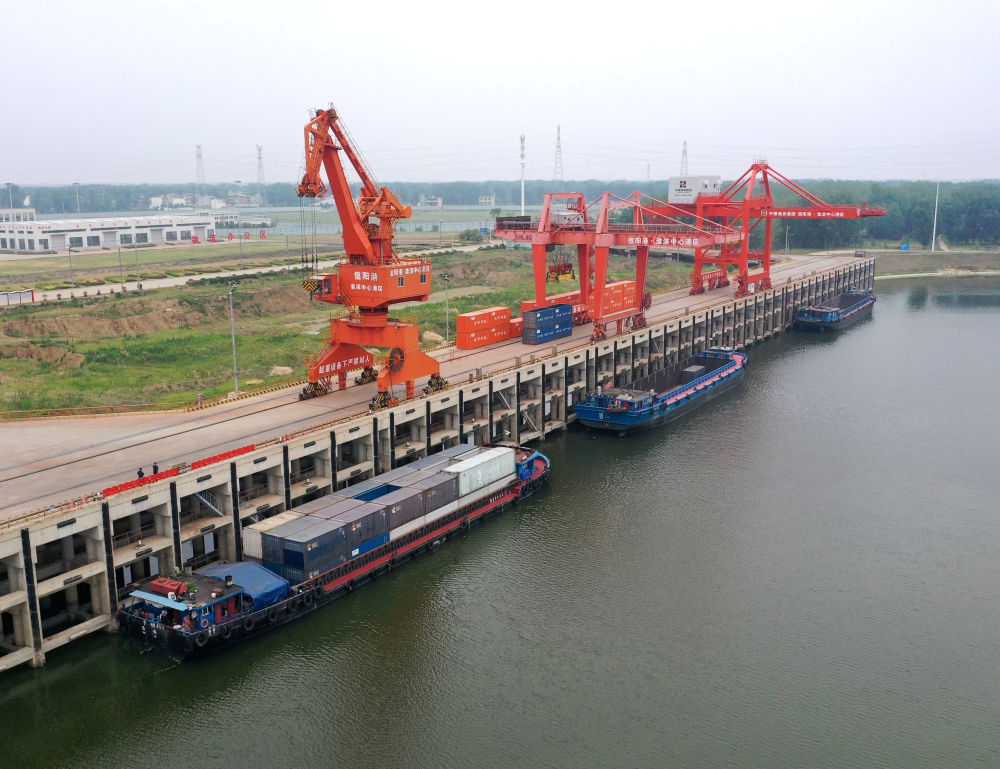 2024年6月5日,貨船停泊在信陽港·淮濱中心港內(nèi)(無人機照片)。新華社記者 李嘉南 攝