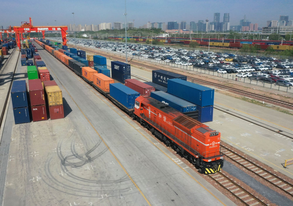 2025年4月15日,X8003次中歐班列(鄭州)停靠在國鐵集團鄭州局圃田車站(無人機照片)。新華社記者 李嘉南 攝