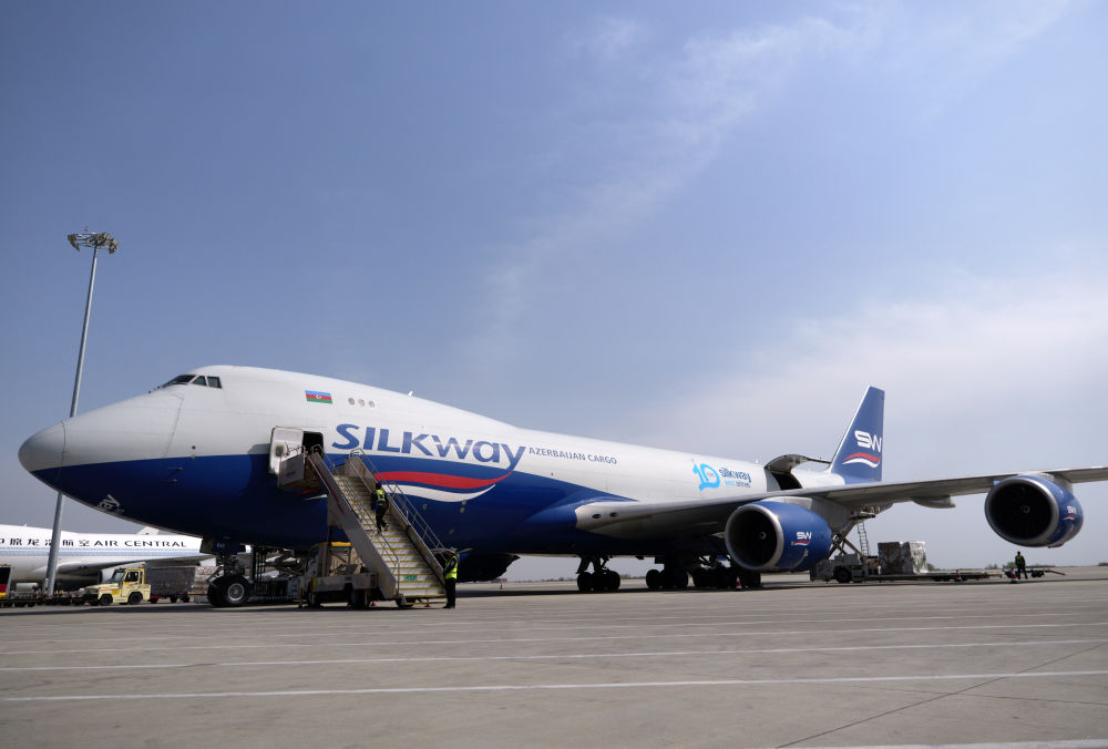 2025年4月2日,一架阿塞拜疆絲綢之路西部航空公司的貨機停靠在鄭州新鄭國際機場停機坪上。新華社記者 李嘉南 攝