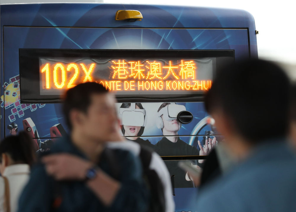 市民和旅客在橫琴口岸澳門口岸區(qū)排隊,準備登上前往港珠澳大橋方向的公交車。新華社記者 王益亮 攝