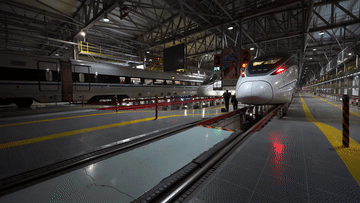動車進入檢修庫內,工作人員正根據(jù)任務計劃進行動車組一級修作業(yè)。