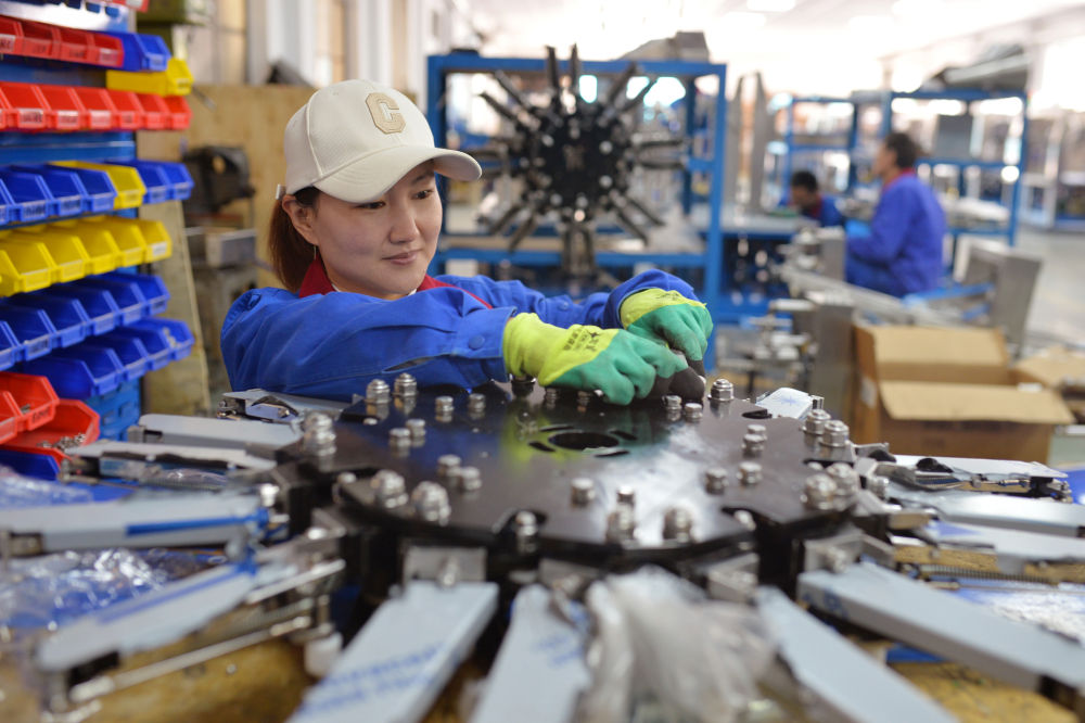 3月30日,在山東省青島市城陽區(qū)夏莊街道青島義龍裝備制造股份有限公司生產(chǎn)車間內,工人在組裝包裝機。新華社發(fā)(王海濱攝)