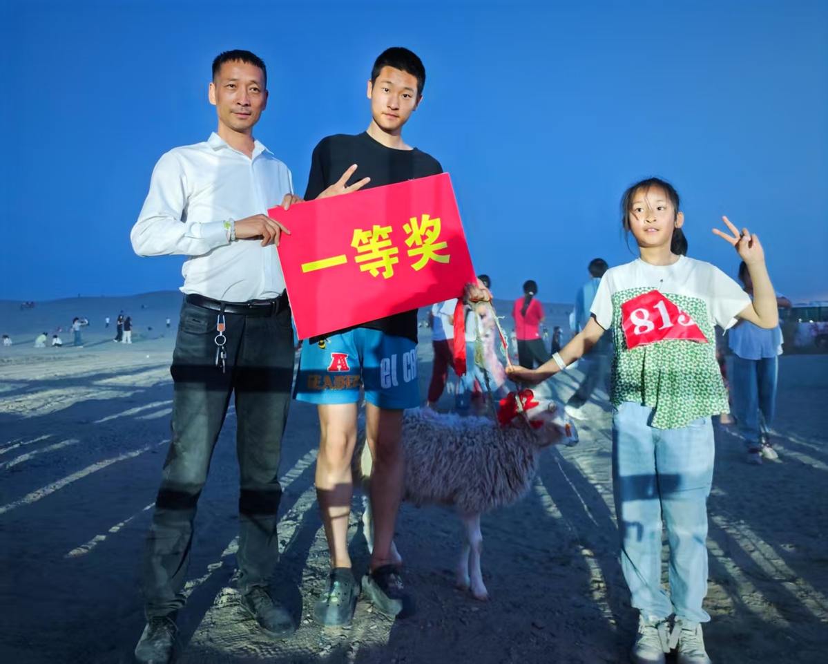 這是5月1日洛浦縣玉龍灣沙漠樂園“大手拉小手”親子徒步比賽家庭組一等獎(jiǎng)獲得者哥哥李一銘與妹妹李鈺瑩在領(lǐng)取獎(jiǎng)品一只羊后與父親的合照。