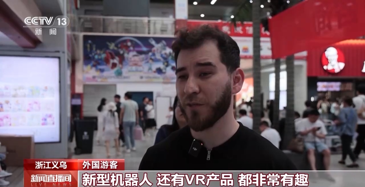 外國游客:我的朋友們是第一次來義烏,他們都很喜歡義烏,因為這里的產(chǎn)品都很有意思,吃住也都很舒適。我們剛剛在體驗AR產(chǎn)品、新型機(jī)器人、VR產(chǎn)品,都非常有趣。