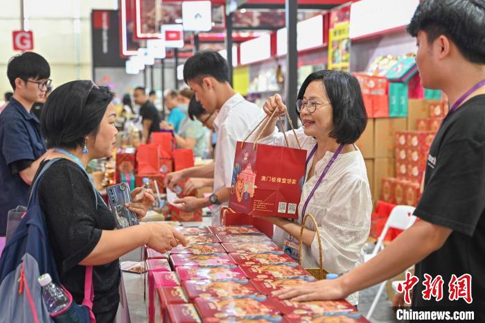 在澳門展館,各種美食、咖啡和葡萄酒吸引采購商前來品嘗,其中,澳門媽閣餅家的展位前擠滿了試吃者。