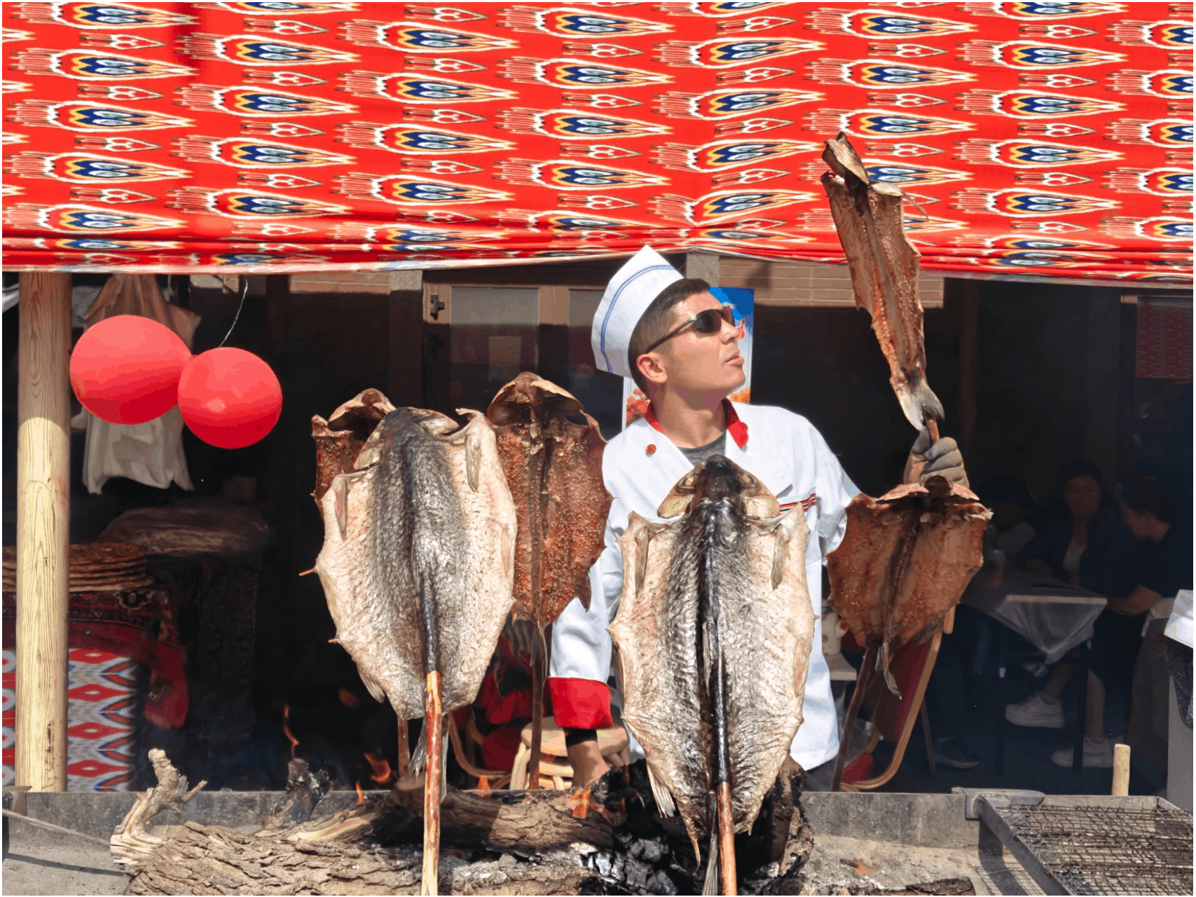 以“烤”為筆、以“味”為墨,2025新疆·尉犁第十二屆羅布人民俗燒烤季繪就一幅熱鬧非凡、充滿地方特色的鮮活畫卷,吸引全疆乃至全國(guó)游客共赴一場(chǎng)美味之約。百余個(gè)燒烤攤位沿青石板路在達(dá)西馕街有序排開(kāi),胡楊木炭在烤爐中明明滅滅,將印著艾德萊斯紋樣的遮陽(yáng)棚映成流動(dòng)的彩緞。本屆燒烤季活動(dòng)整合全縣8個(gè)鄉(xiāng)鎮(zhèn)的特色美食與文旅資源,帶動(dòng)200余戶農(nóng)牧民增收,讓烤肉、烤鴿子、烤魚等“鄉(xiāng)味”變身“網(wǎng)紅”,推動(dòng)“舌尖經(jīng)濟(jì)”向“品牌經(jīng)濟(jì)”不斷升級(jí)。
