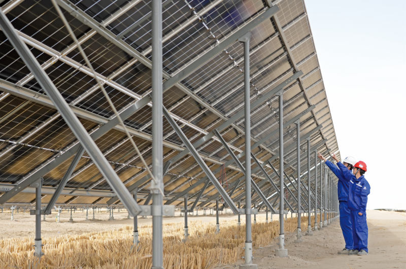 在塔克拉瑪干沙漠北緣,中電建阿克蘇地區(qū)沙雅縣25萬千瓦光伏產業(yè)園區(qū),一個個光伏板被“種植”在沙漠中,通過吸收陽光轉化為清潔電能。光伏板下,由蘆葦稈扎成的草方格如同棋盤鋪向遠方,每個1米×1米的方格內,嫩綠的梭梭苗正破土而出。