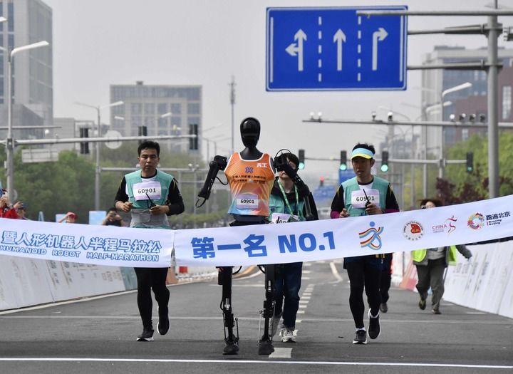 2025年4月19日,在北京亦莊舉行的2025北京亦莊半程馬拉松暨人形機(jī)器人半程馬拉松比賽上,天工隊選手天工Ultra(左二)沖向終點。