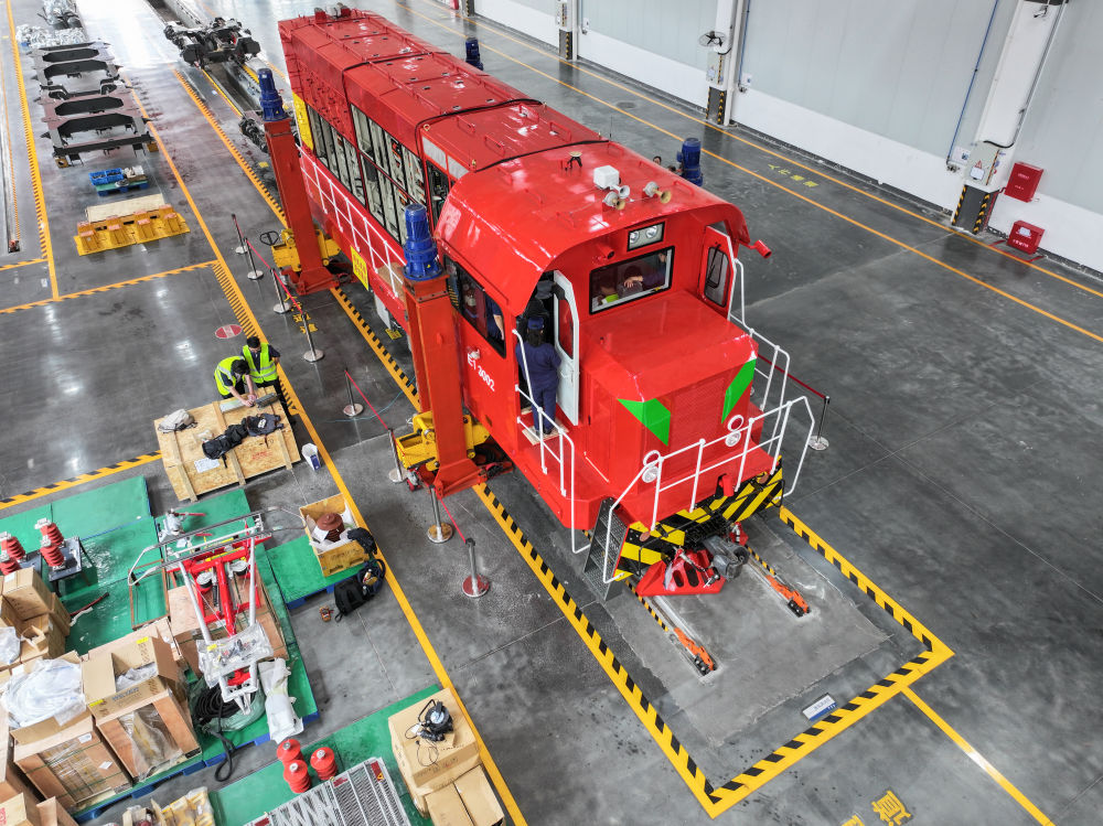 這是4月26日在湖南株洲聯(lián)誠集團(tuán)控股股份有限公司新產(chǎn)業(yè)事業(yè)部車間拍攝的一臺準(zhǔn)備改造成新能源的機(jī)車(無人機(jī)照片)。新華社記者 陳澤國 攝