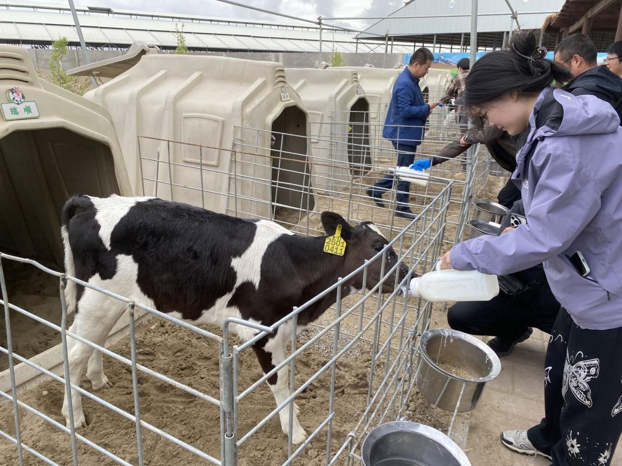 圖為天瑞祥牧場研學基地,游客在體驗給小牛喂奶。冶明偉攝