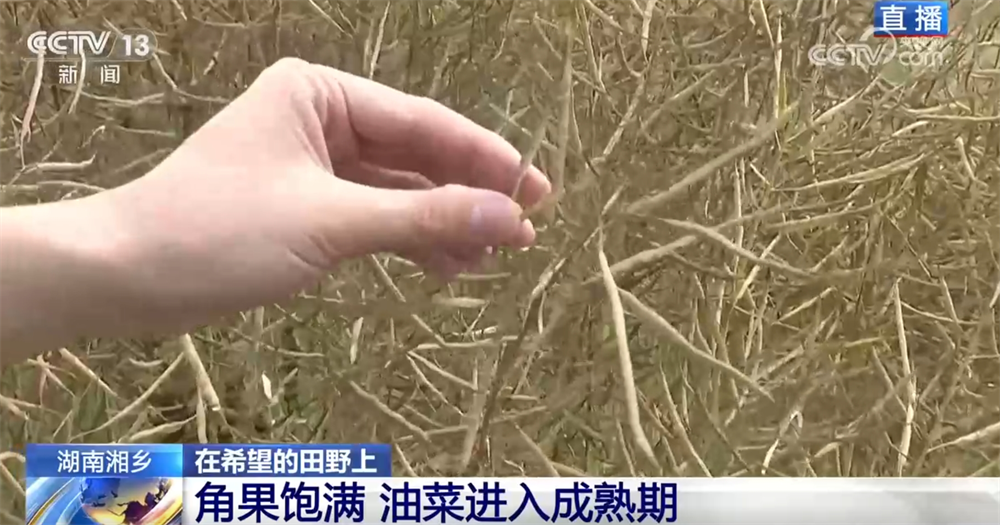 記者來到了湘潭湘鄉(xiāng)市泉塘鎮(zhèn)雙江村,油菜現在長得怎么樣了?油菜的頂端已經呈金黃色,角果很飽滿,我們平時常說的油菜籽就藏在金黃色的角果里,這說明現在油菜已經進入成熟期了。