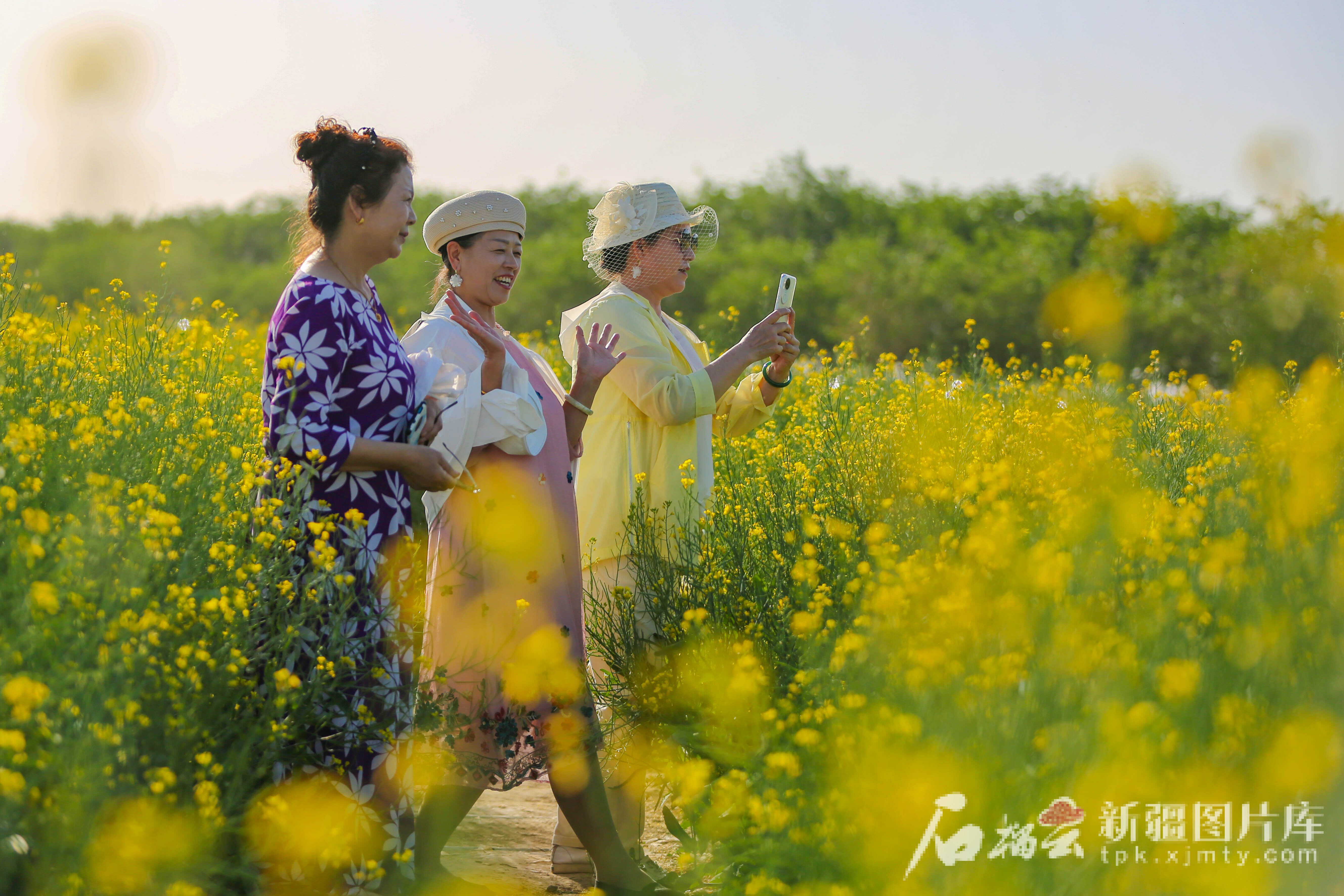 5月9日,游客在昌吉市六工鎮(zhèn)十三戶(hù)村千畝油菜花田景區(qū)拍照。