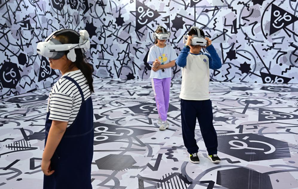 4月26日,小朋友們在第三屆中國(安徽)科技創(chuàng)新成果轉(zhuǎn)化交易會上體驗VR設備。新華社記者 周牧 攝
