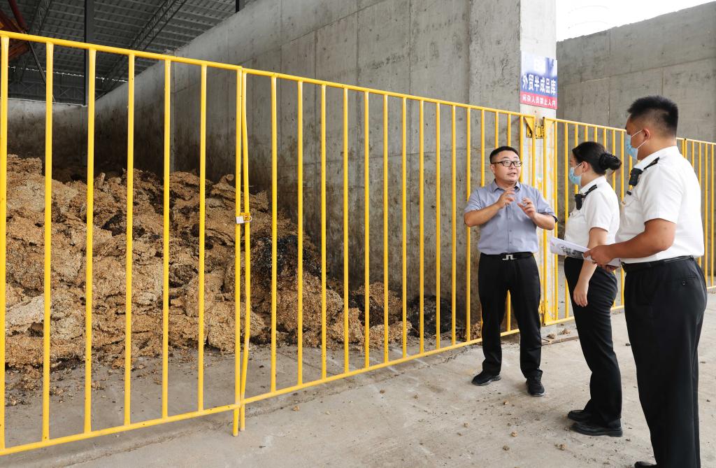 5月28日,在海南象元實業(yè)有限公司,企業(yè)人員向??诤jP(guān)所屬三亞海關(guān)關(guān)員介紹企業(yè)進口的橡膠原材料。新華社記者金皓原 攝