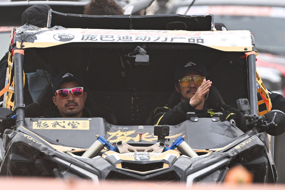 ↑6月1日,駕長車隊(duì)車手吳京(右)、領(lǐng)航員梁冬冬在賽后參加收車儀式。新華社記者 辛悅衛(wèi) 攝