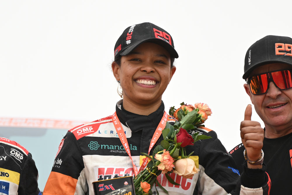 ↑6月1日,零公里潤滑油ZM-Buggyra車隊(duì)塞舌爾車手阿莉亞·科洛克參加收車儀式。新華社記者 辛悅衛(wèi) 攝