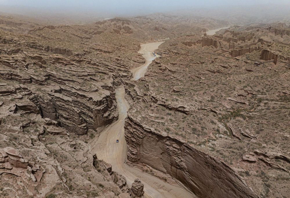 ↑5月21日,賽車行駛在第一賽段賽道上(無人機(jī)照片)