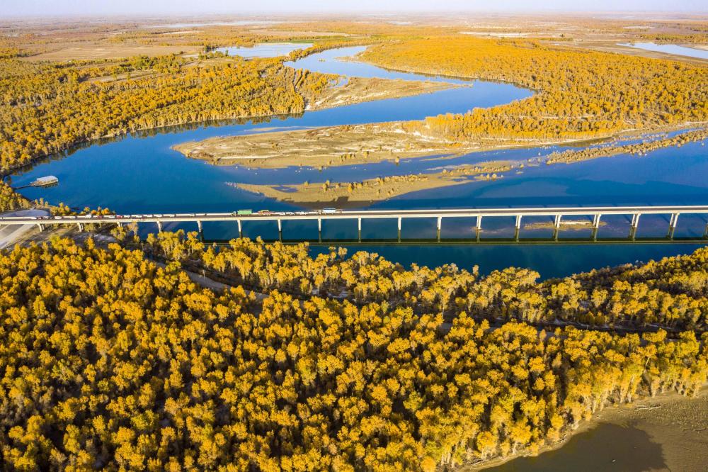 沿途穿越多片胡楊林,風(fēng)景壯麗。新華社記者 胡星宇 攝