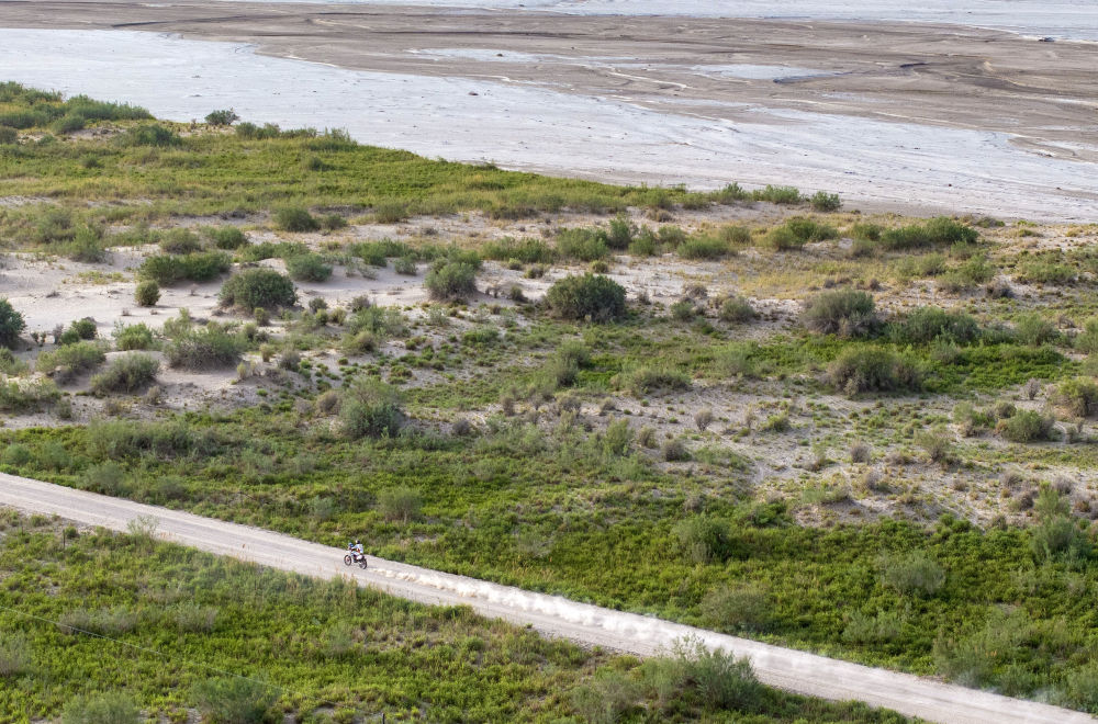 ↑5月26日,一輛摩托車行駛在第五賽段賽道上(無人機(jī)照片)