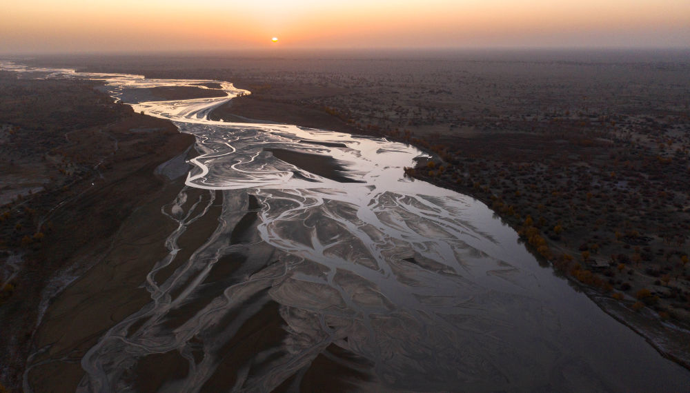 ↑這是在塔克拉瑪干沙漠腹地拍攝的新疆于田克里雅河國家濕地公園(2019年11月10日攝,無人機(jī)照片)。新華社記者 胡虎虎 攝