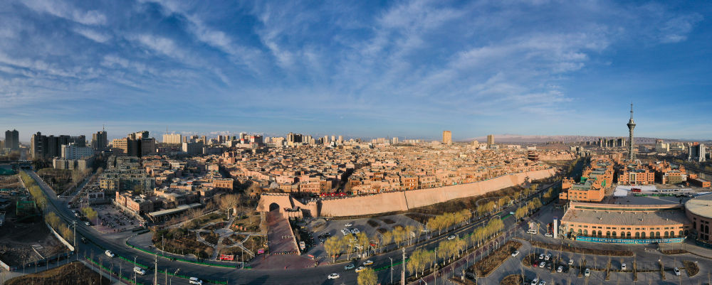 ↑清晨的喀什古城(2023年3月10日攝,無人機(jī)照片)。新華社記者 李響 攝