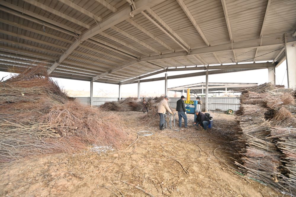 農牧民們正在使用割灌機加工紅柳枝條。新華社記者 馬金瑞 攝