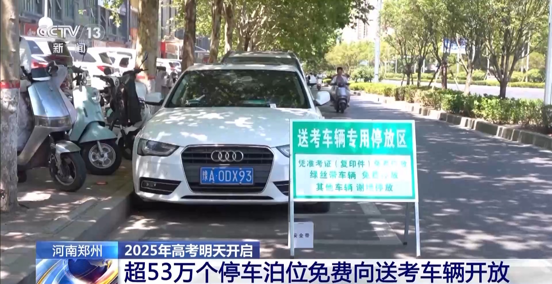在河南鄭州,公交、城管等部門通過開展噪聲管控、開放免費(fèi)停車泊位。在鄭州市一個(gè)考點(diǎn)附近,周邊的道路停車泊位上,已經(jīng)設(shè)置了“送考車輛專用停放區(qū)”的引導(dǎo)牌。旁邊一個(gè)經(jīng)營性停車場,考試期間也向送考車輛免費(fèi)開放。據(jù)了解,今年高考期間,鄭州城管部門共設(shè)置各類高考停車泊位超53萬個(gè)。