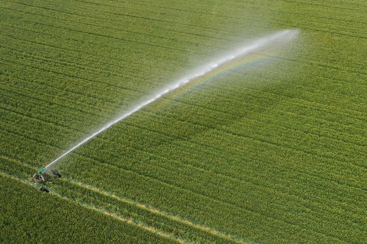 2025年5月7日,一臺(tái)自走式噴灌機(jī)在河南省焦作市溫縣黃莊鎮(zhèn)南韓村麥田間作業(yè)(無(wú)人機(jī)照片)。新華社發(fā)(徐宏星攝)