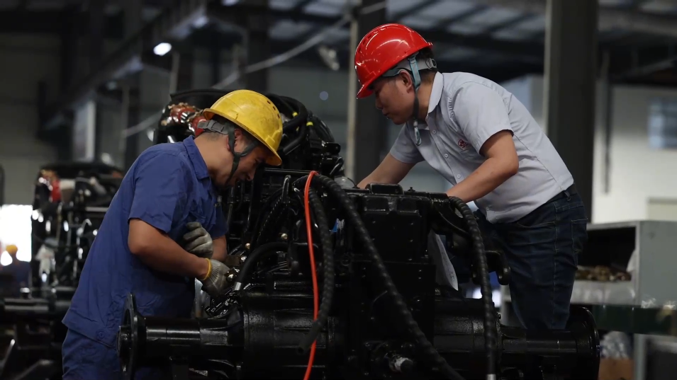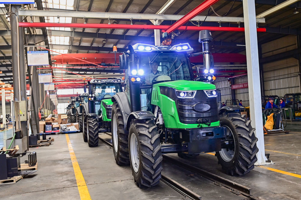 5月15日,在山東省青州經(jīng)濟(jì)開發(fā)區(qū)一家大型農(nóng)機(jī)制造企業(yè),工人調(diào)試檢驗(yàn)出口海外的大馬力拖拉機(jī)。新華社發(fā)(王繼林 攝)