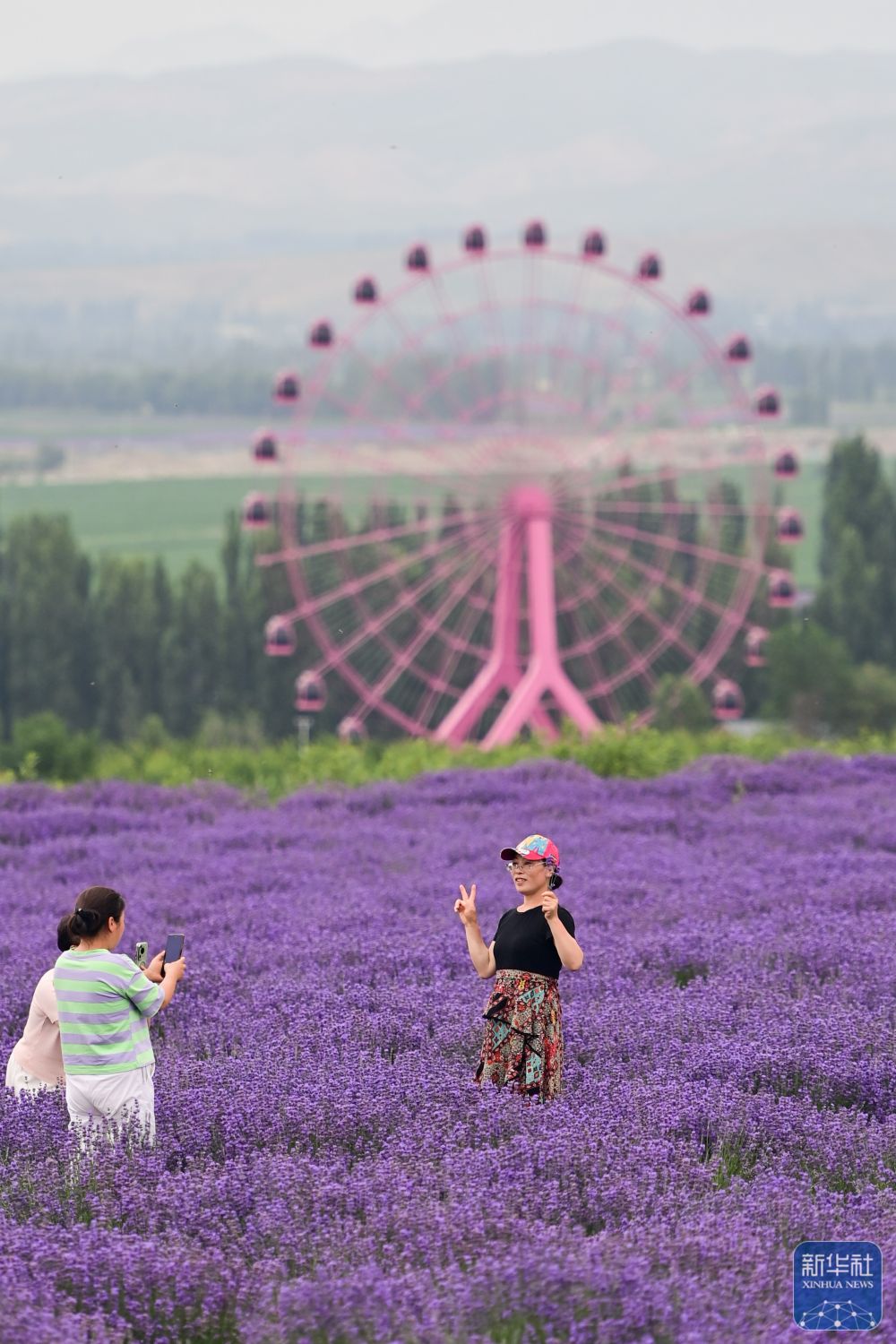 游客在新疆伊犁哈薩克自治州霍城縣解憂公主薰衣草農(nóng)場(chǎng)游玩(6月14日攝)。