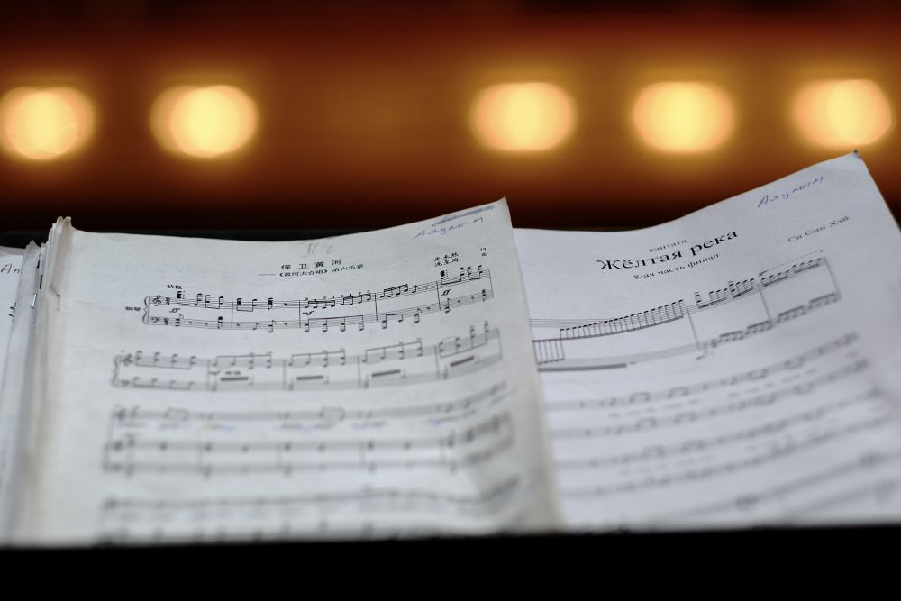 6月12日,在哈薩克斯坦阿拉木圖江布爾國家音樂廳拍攝的《黃河大合唱》中、俄文曲譜。新華社記者 鄭開君 攝