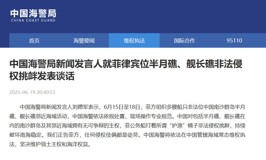 中國海警局新聞發(fā)言人劉德軍表示,6月15日至18日,菲方組織多艘船只非法位中國南沙群島半月礁、艦長礁鄰近海域活動(dòng),中國海警依法依規(guī)處置,現(xiàn)場操作專業(yè)規(guī)范。中國對(duì)包括半月礁、艦長礁在內(nèi)的南沙群島及其鄰近海域擁有無可爭辯的主權(quán),菲公務(wù)船打著所謂“護(hù)漁”幌子非法侵權(quán)挑釁,持續(xù)破壞南海穩(wěn)定。我們正告菲方,任何侵權(quán)伎倆都是徒勞。中國海警將依法在中國管轄海域常態(tài)維權(quán)執(zhí)法,堅(jiān)決維護(hù)領(lǐng)土主權(quán)和海洋權(quán)益。