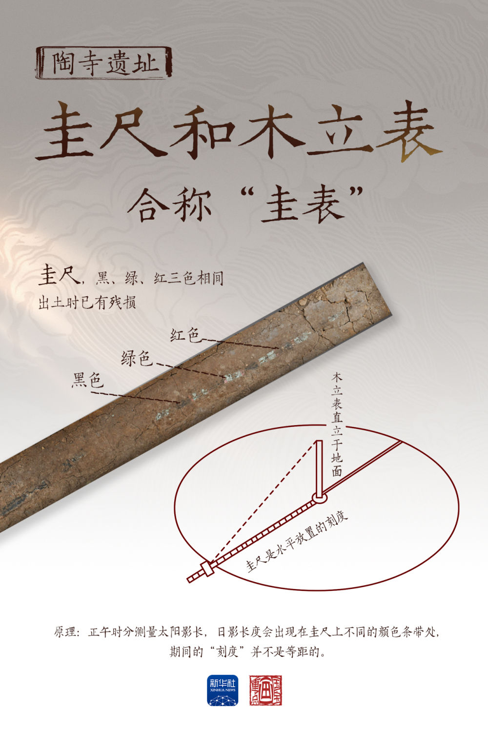 圭尺和木立表,是陶寺遺址出土的另外一件觀天象、授人時(shí)的文物,合稱“圭表”。木立表直立于地面,圭尺是水平放置的刻度。圭表測量太陽影長,與觀象臺(tái)相輔相成,用于太陽歷法的制定。黑、綠、紅三色相間的漆木桿“圭尺”,出土?xí)r已有殘損,殘長171.8厘米,復(fù)原長度187.5厘米。正午時(shí)刻,太陽照在木立表上,投下的影子被圭尺上的刻度標(biāo)記出長短。在夏至、春分和秋分,日影長度會(huì)出現(xiàn)在圭尺上不同的顏色條帶處,期間的“刻度”并不是等距的。