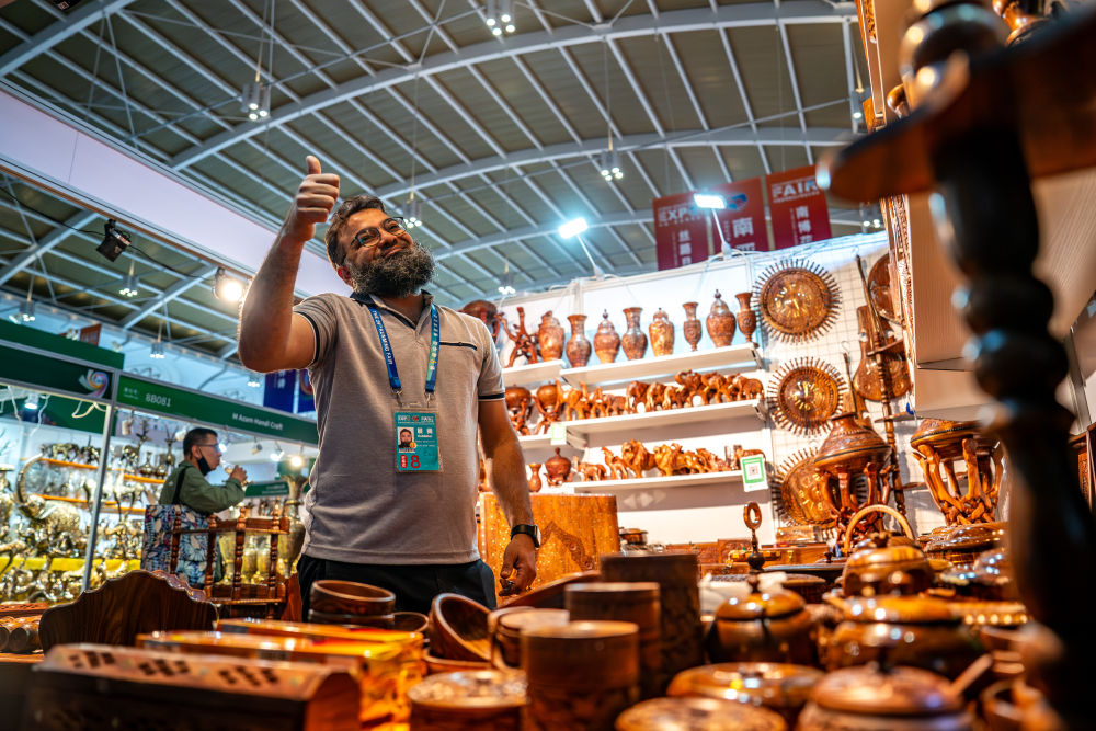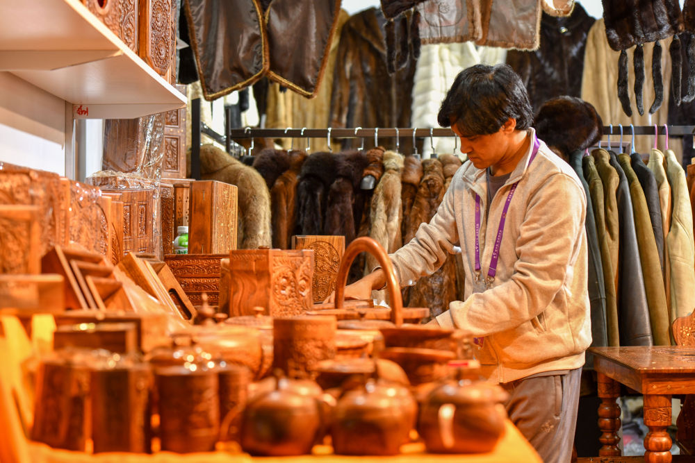 6月20日,顧客在南亞館巴基斯坦展區(qū)選購銅制工藝品。