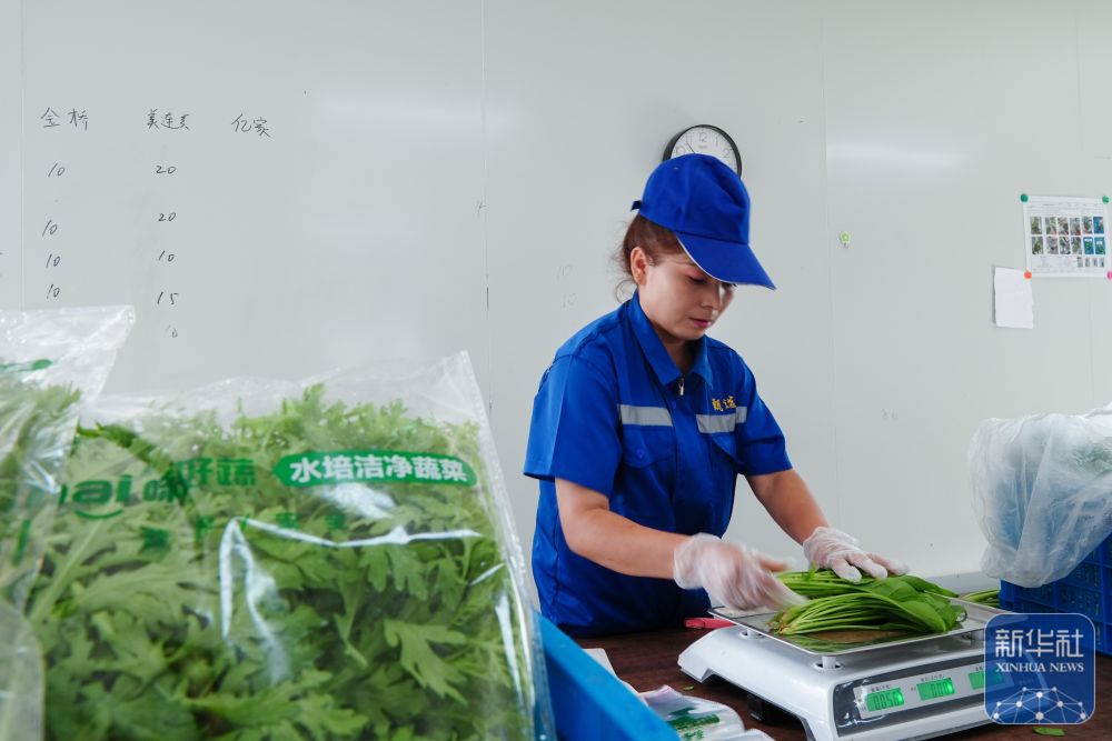 ↑ 6月25日,在新疆阿克蘇地區(qū)庫車市甬庫同心村智慧農(nóng)業(yè)植物工廠,工作人員對收獲的農(nóng)作物進(jìn)行稱重打包。