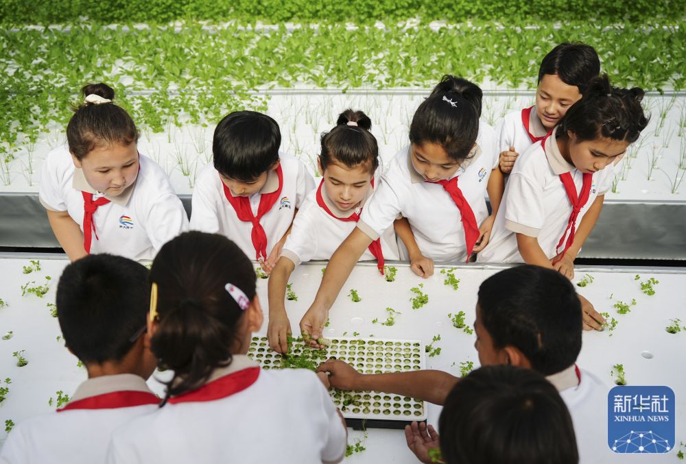 ↑ 6月25日,在新疆阿克蘇地區(qū)庫車市甬庫同心村智慧農(nóng)業(yè)植物工廠,當(dāng)?shù)匦W(xué)生體驗無土栽培。