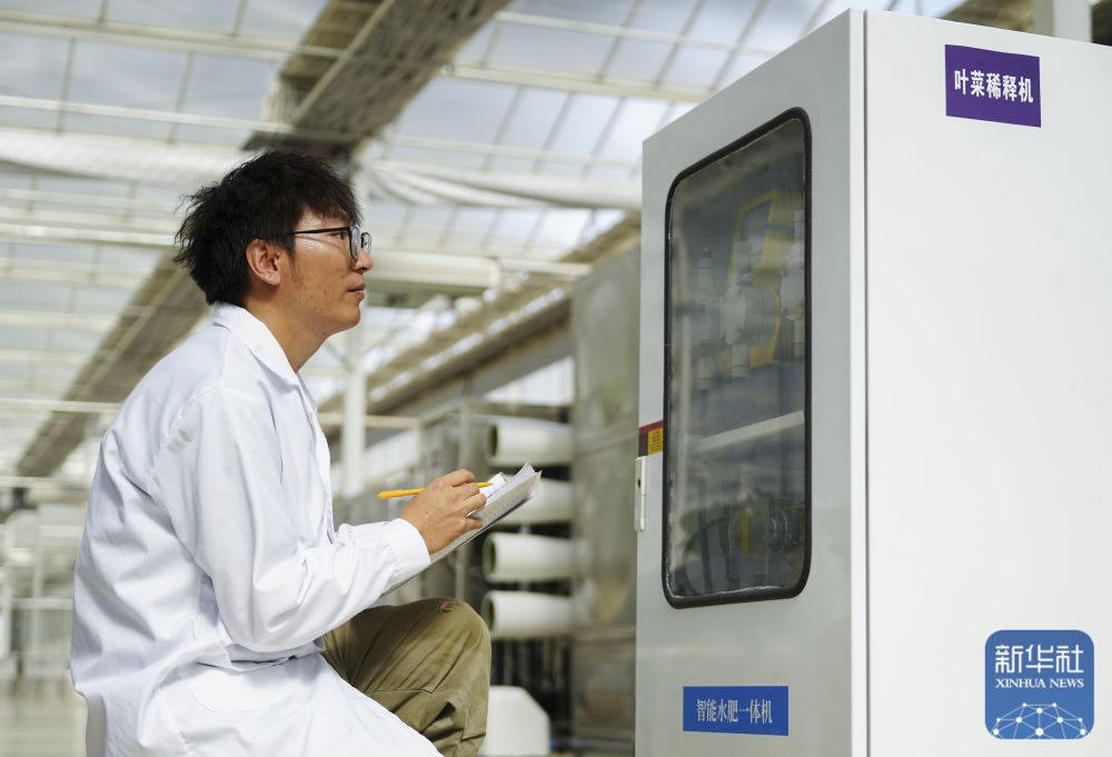 ↑ 6月25日,在新疆阿克蘇地區(qū)庫車市甬庫同心村智慧農(nóng)業(yè)植物工廠,工作人員在監(jiān)測記錄智能水肥一體機(jī)運(yùn)行情況。