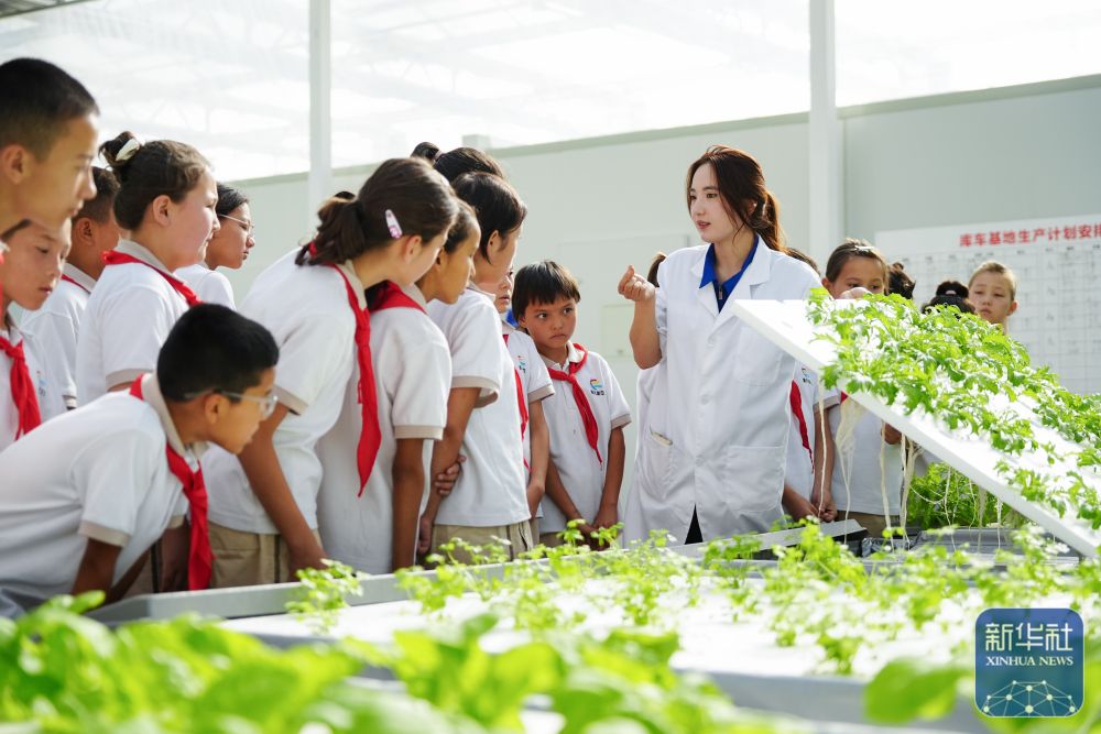 ↑ 6月25日,在新疆阿克蘇地區(qū)庫車市甬庫同心村智慧農(nóng)業(yè)植物工廠,工作人員為當(dāng)?shù)匦W(xué)生講解無土栽培技術(shù)。