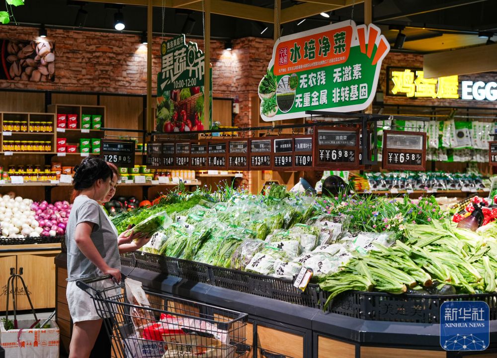 ↑ 6月25日,在新疆阿克蘇地區(qū)庫車市美連美超市,人們在選購甬庫同心村智慧農(nóng)業(yè)植物工廠的農(nóng)產(chǎn)品。
