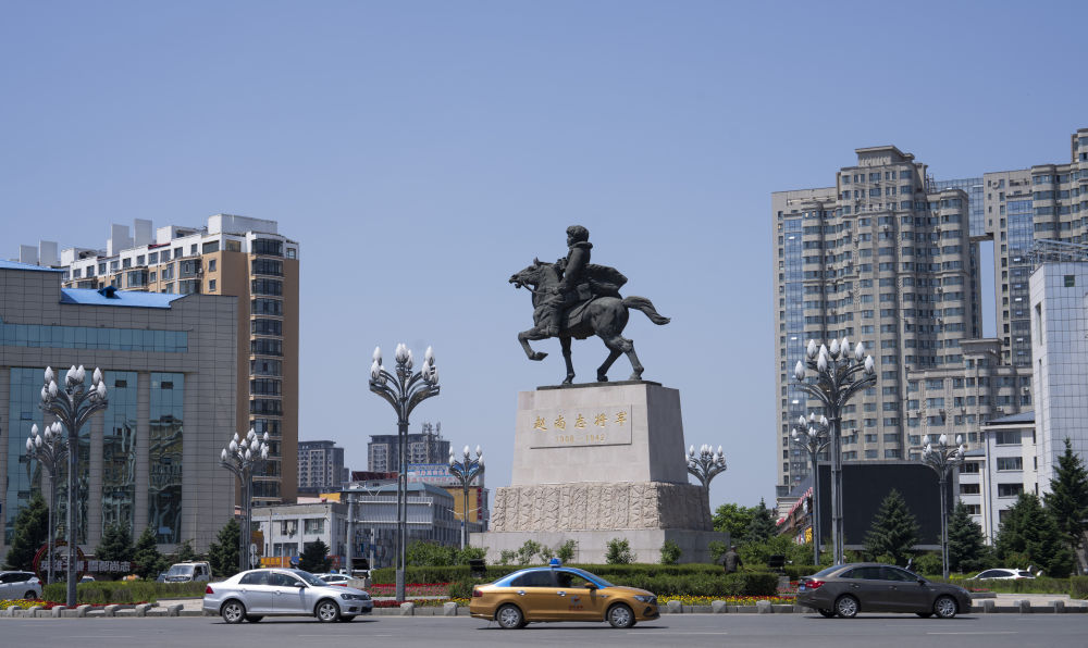 驅(qū)車駛?cè)牒邶埥∩兄臼校谎郾憧匆姯h(huán)島中心屹然挺立的高大銅像:趙尚志將軍身騎戰(zhàn)馬,戎裝飛揚(yáng),他望向遠(yuǎn)方,好似凝視這一方和平安寧。